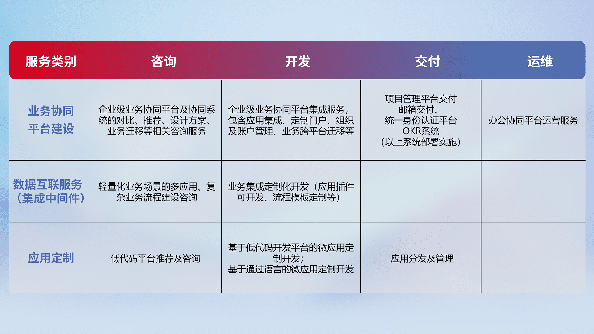 针对钉钉、、、企微、、IDaas等平台级产品提供产品的规划、、方案、、、交付、、定制化开发等服务,,实现如统一协同办公、、智能客户服务、、混合会议管理、、、、智能数据查询、、等业务场景,,实现数字化转型。。