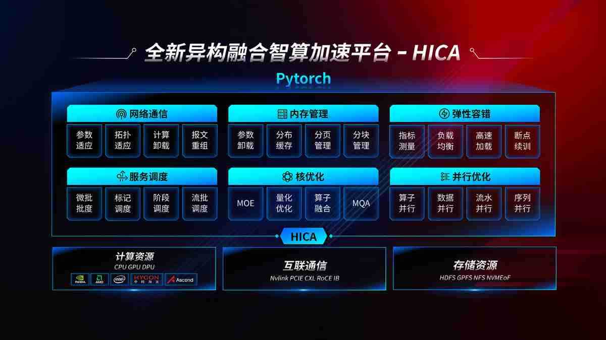 通过自研的服务层、、、中间适配层、、、以及调度编排算法,,,,采用数据并行、、、模型并行等多种并行方式,,,把并行计算任务进行有效的分解,,使其分别由相应的软件栈和算力资源来承接。。。当GPU资源变化,,,,HICA可以实时动态调度计算子任务并调整模型拓扑和架构,,以充分聚合各种算力资源。。。