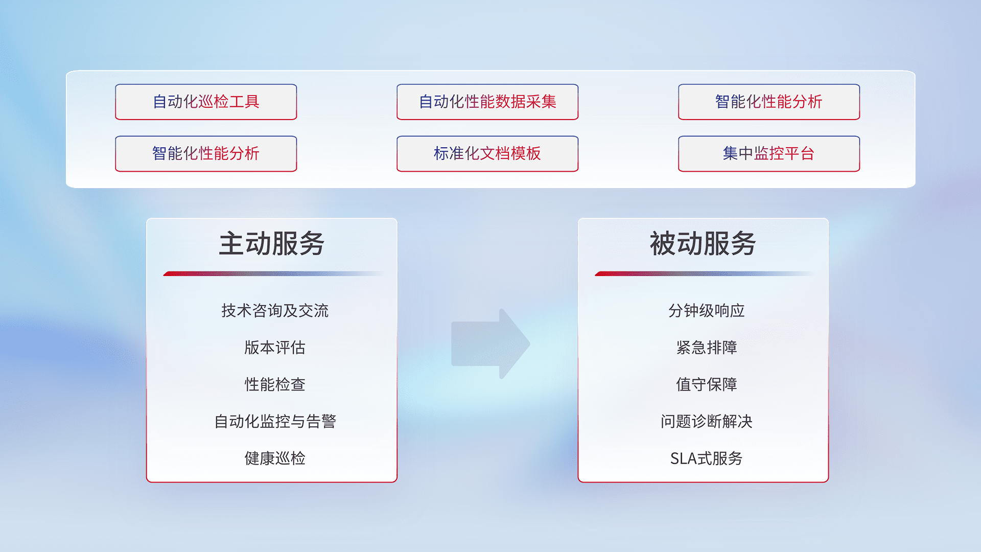 智能化工具和标准化文档,,,保障服务质量,,,提供主动服务(包含技术咨询、、、、版本评估、、性能检查、、自动化监控与告警、、健康巡检)和被动服务包含(分钟级响应、、、紧急排障、、值守保障、、问题诊断解决、、SLA服务)。。。