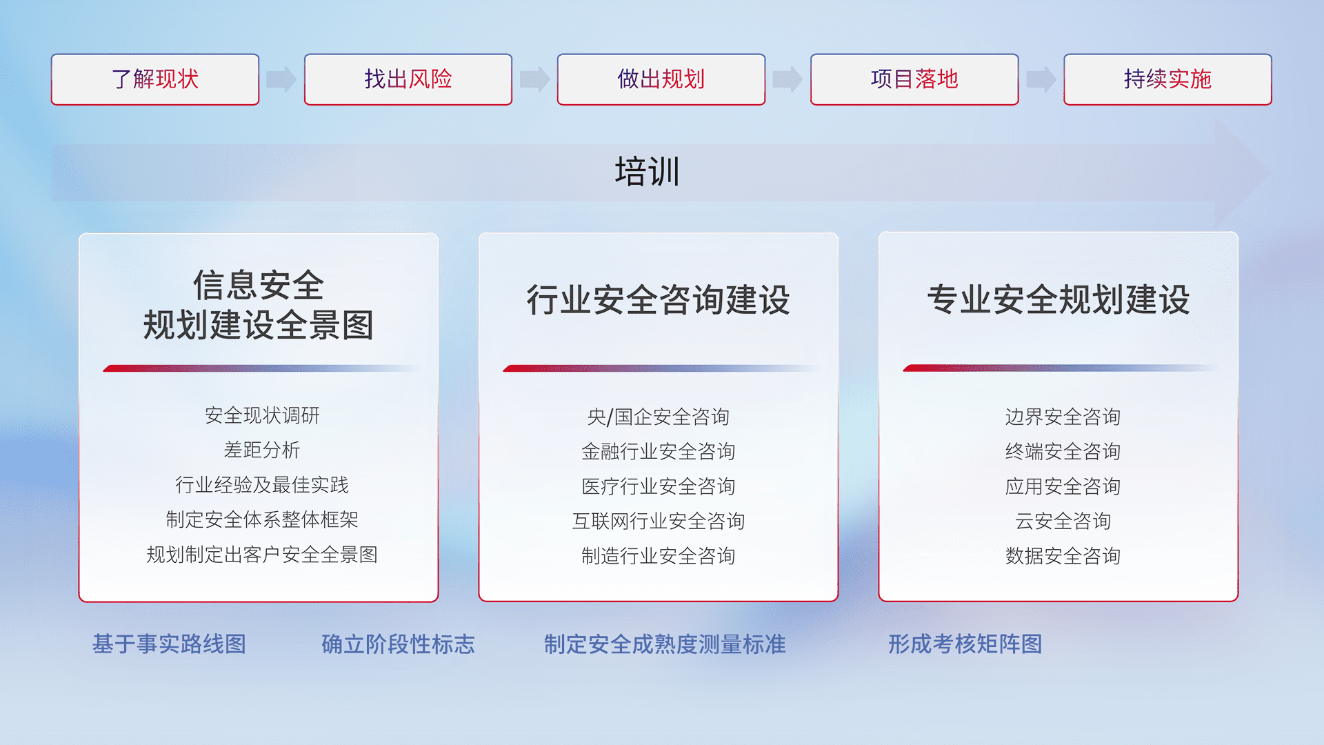 针对客户行业特性,,,,以专业的安全服务+多厂商联合解决方案提供专属的一站式安全管理服务,,,,帮助客户全面感知网络空间威胁,,,,基于识别、、、、检测、、分析、、防护、、、监测、、、、响应的服务理论模型,,,从方案咨询、、、、集成交付、、、、评估验证、、、、优化加固、、、、运维运营,,致力于为客户提供完整的闭环管理式安全服务。。。。以实战经验为客户打造高抵御风险的安全体系,,,帮助客户发现威胁、、、对抗威胁、、、处置威胁,,,不断积累安全对抗能力,,,,持续保障数字化安全。。